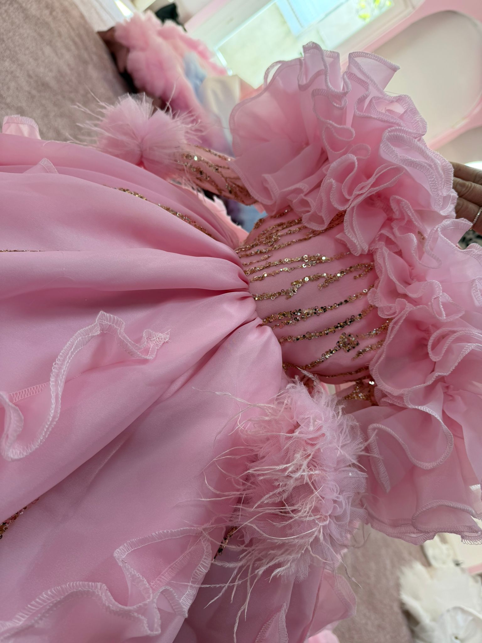 •Détails : Broderies scintillantes, volants, plumes