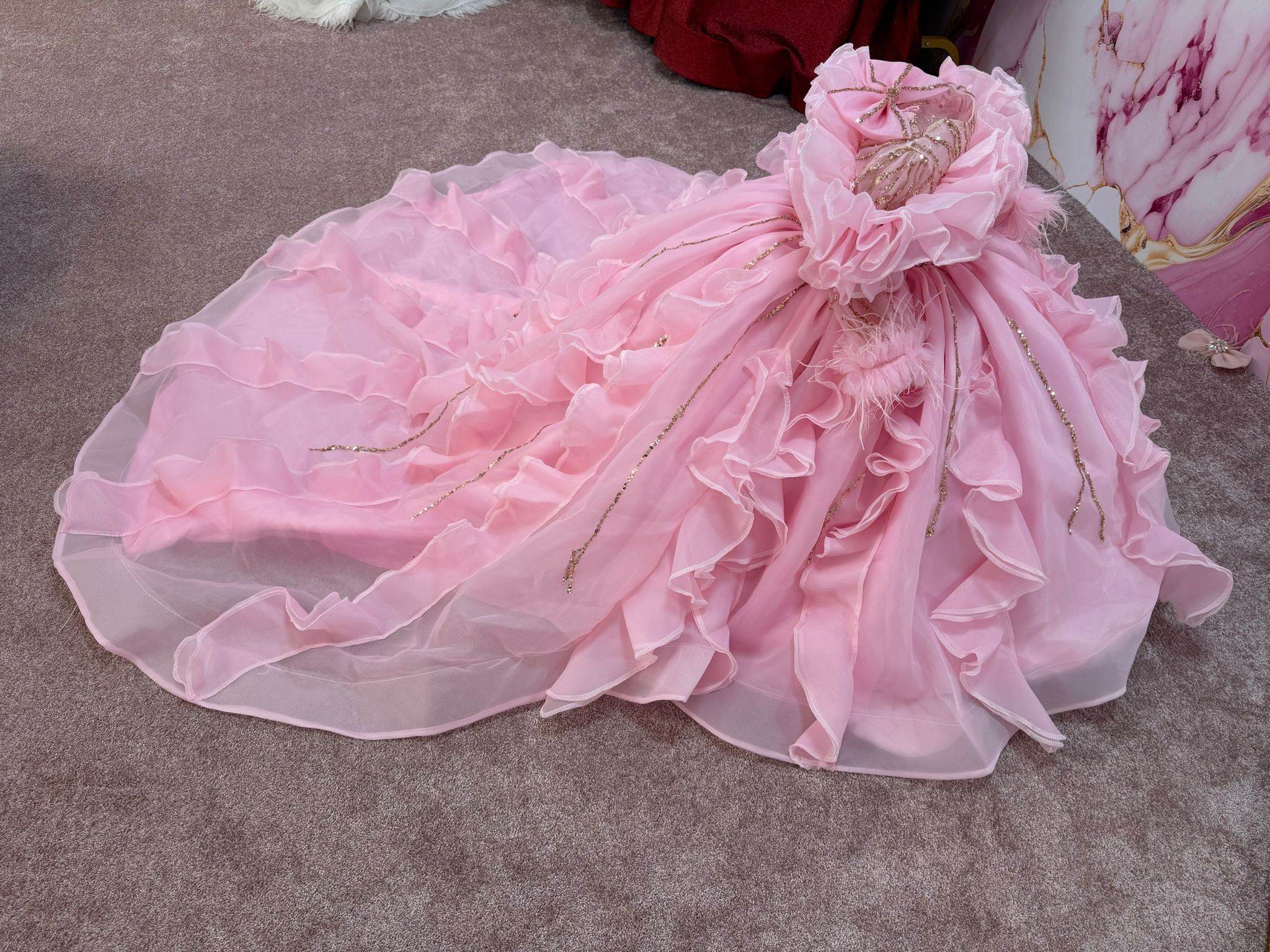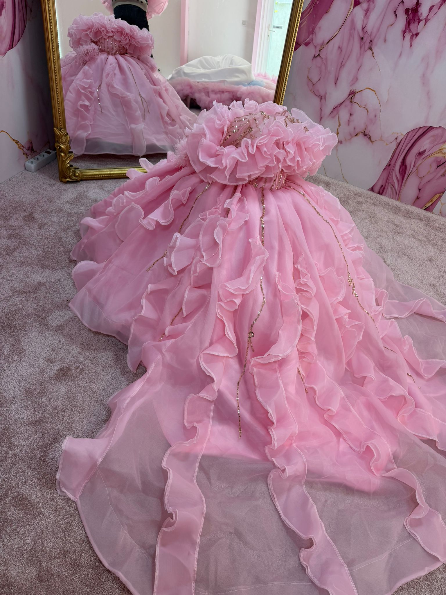 Plongez dans un univers féerique avec cette somptueuse robe rose, véritable ode à la délicatesse et au raffinement. Confectionnée dans un voile léger et aérien, elle se distingue par ses multiples volants vaporeux qui créent un mouvement spectaculaire à chaque pas.